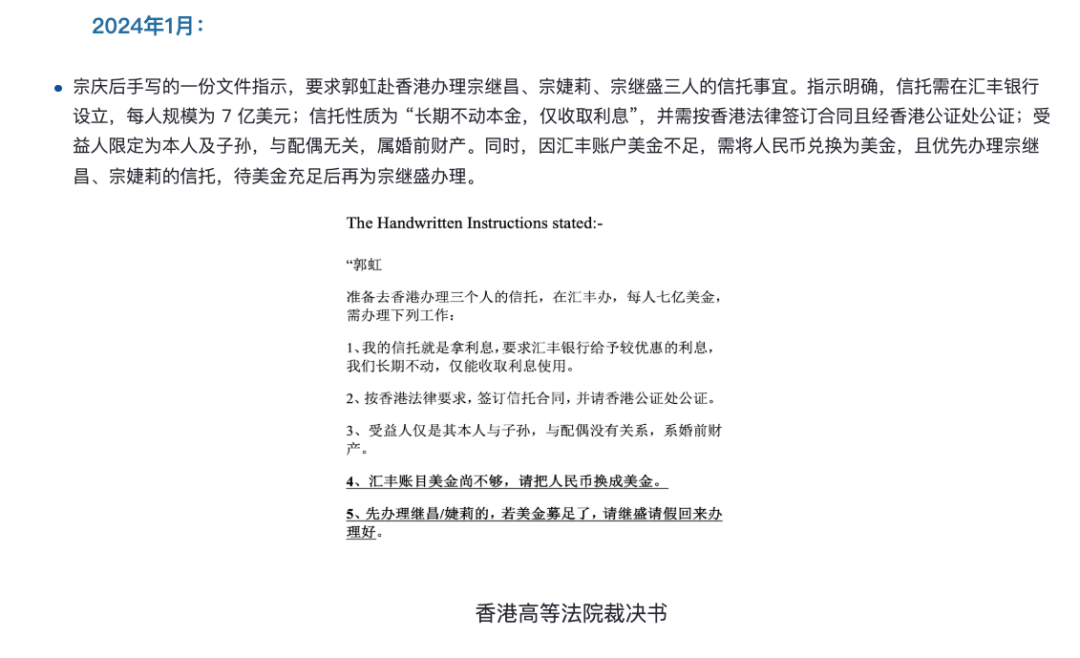 简单来说,宗庆后在去世前,为自己的三名非婚生子女宗继昌、宗婕莉、宗继盛留下了每人7亿美元的信托,但由于宗馥莉介入,这份信托权益尚未完全履行,并且宗馥莉还调用了该账户的108.5万美元。