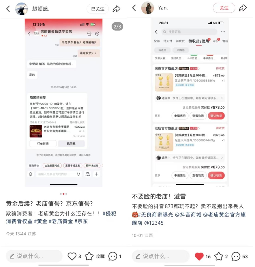 无独有偶,还有用户提到,近期自己在另外一家电商平台上购买“老庙官方旗舰店”的足金葫芦摆件、足金大米摆件,明明已经下单,顺丰快递也已经发货,但后续却显示快件被退回。该用户表示“老庙黄金,卖不起别出来丢人。”