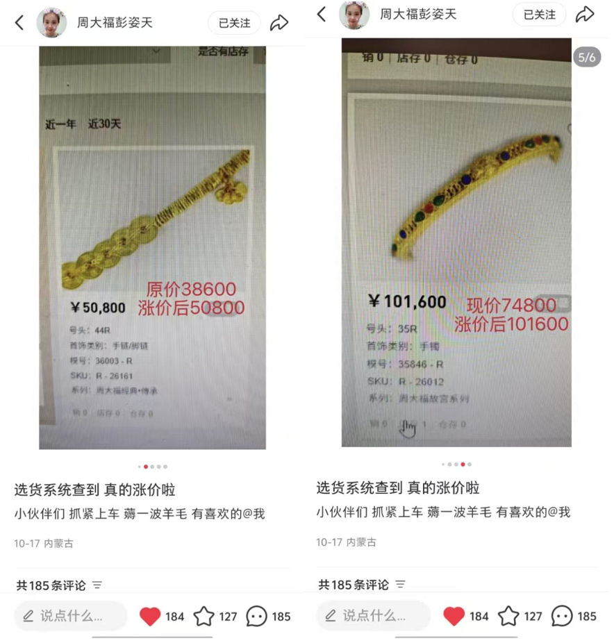 除了订单履约问题,黄金价格飙涨还引发了黄金饰品定价方式的争议。近期多家知名金店宣布上调产品价格,涨幅普遍在10%以上,其中以周大福和老庙黄金等品牌的调价最为引人注目。
